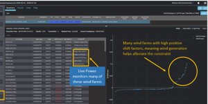 Let’s dig into the SANMIGL 345KV SANMIGL_ATAH constraint, which has bound for over 8 hours in the last month and reached max shadow prices of over $2,000. Using the Constraint Summary module in Yes Energy, we can see that this appears to be a wind-driven constraint. You can tell that by coloring the shift factors in the bottom right chart by Wind Farms, which means any blue dot is a price node associated with a wind farm. A blue dot in the top right corner has a high positive shift factor relative to this constraint, meaning if it’s a generator node then by generating it helps alleviate the constraint. Conversely, dots in the bottom left have high negative shift factors relative to the constraint, meaning ramping down generation helps alleviate the constraint. As you can see from the cluster of blue dots in the top right corner, there are many wind farms with high positive shift factors, meaning they can reduce congestion by generating. As you can see in the price node table in the bottom left, Live Power monitors many of these wind farms.