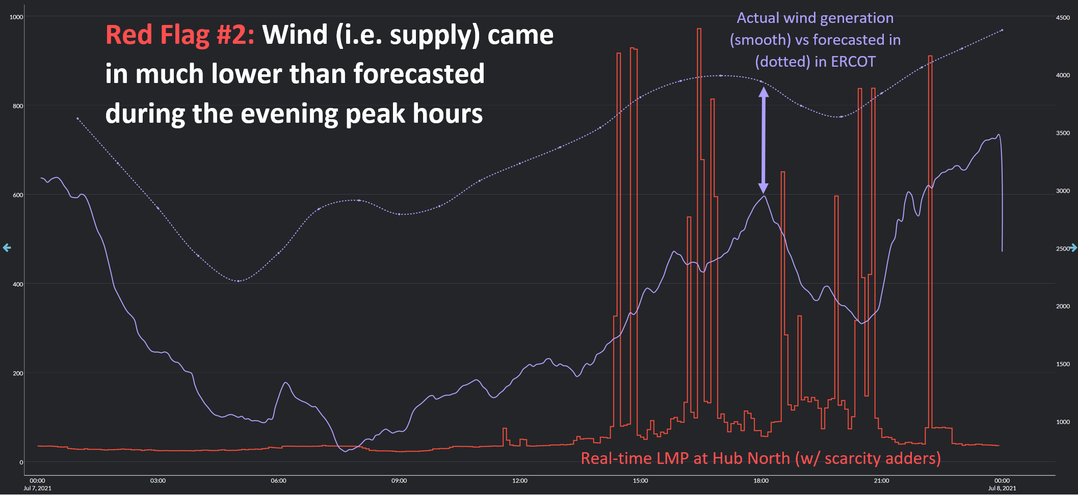 The second red flag was that wind came in much lower than forecasted during the time when load came in higher than forecasted. In the chart below, the smooth purple line is the actual wind generation in ERCOT compared with the dotted purple line, which is the original wind generation forecast. The wind forecast error reached a low of -2,000 MW in the evening peak hours on July 7th.