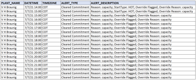 The first table below are the RUC alerts issued by ERCOT for the Live Power monitored plant Sim Gideon on July 7th, which had cleared RUC commitments from 2 pm through the end of the day.